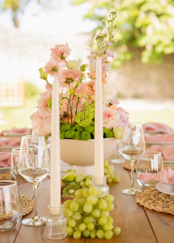 Das Farbkonzept dieses Tages war wie ein stilles Statement: Trauben, Limetten, Zitronen, übersetzt in Details, die frisch wirken, aber nicht verspielt. Dazu Florals in pastelligen Greens, zartem Rosa und einem Hauch Lila: leicht, modern, sommerlich und dabei editorial, weil alles bewusst reduziert blieb.