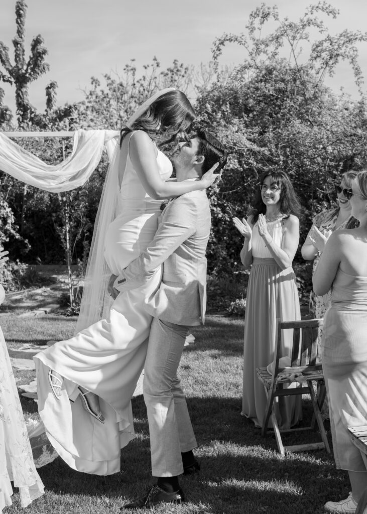 Und dann der Auszug: dieser eine Moment, der alles zusammenfasst, er hebt sie hoch, ein Kuss mitten im Gang, pures Lachen, pures „Wir“. Genau solche Sekunden machen eine Hochzeit zeitlos, weil sie nicht wiederholbar sind und genau deshalb so wertvoll.