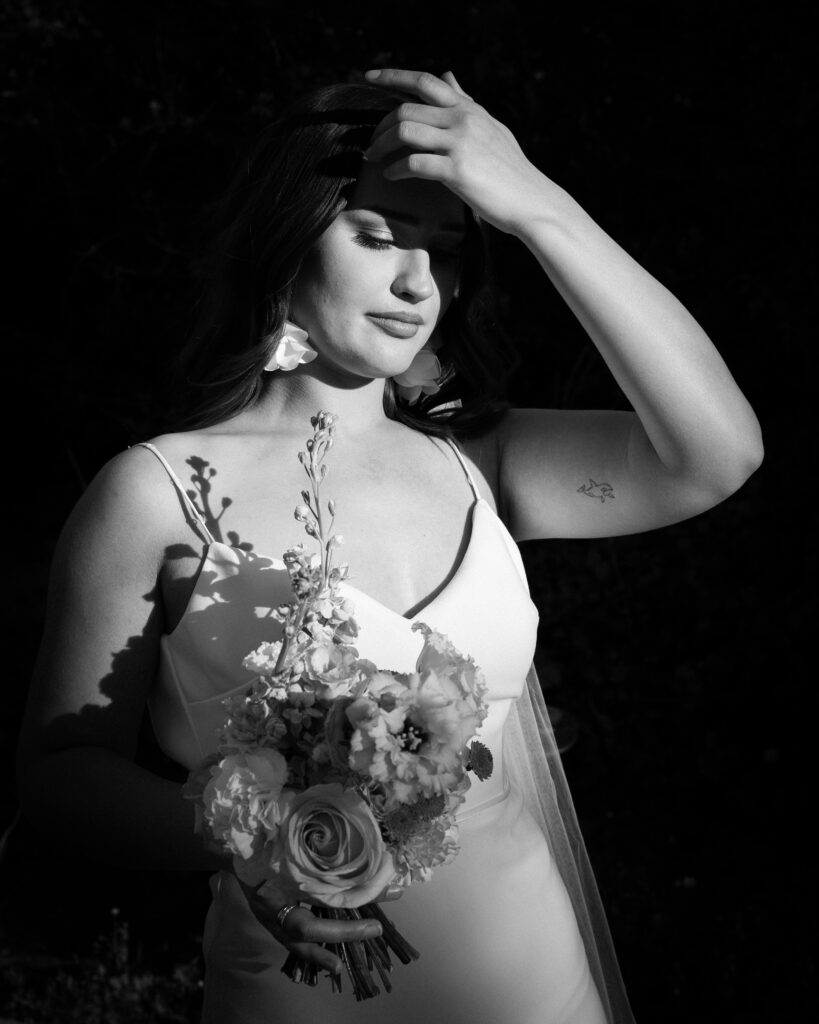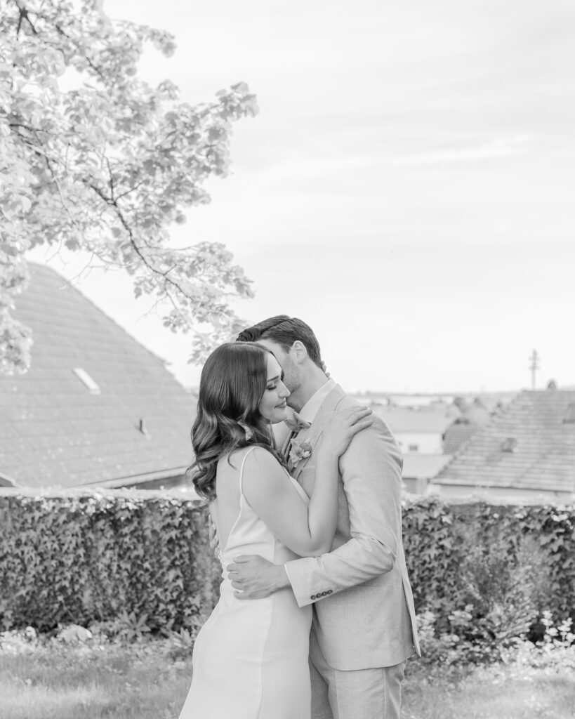 Nach der Trauung haben wir uns Zeit genommen für Portraits, die sich nicht nach „Posing“ anfühlen. Erst das Paarshooting – ruhig, nah, mit klaren Linien und weichem Licht. Danach ein paar Braut-Portraits solo: minimalistisch, elegant, mit Fokus auf Ausdruck und Details.